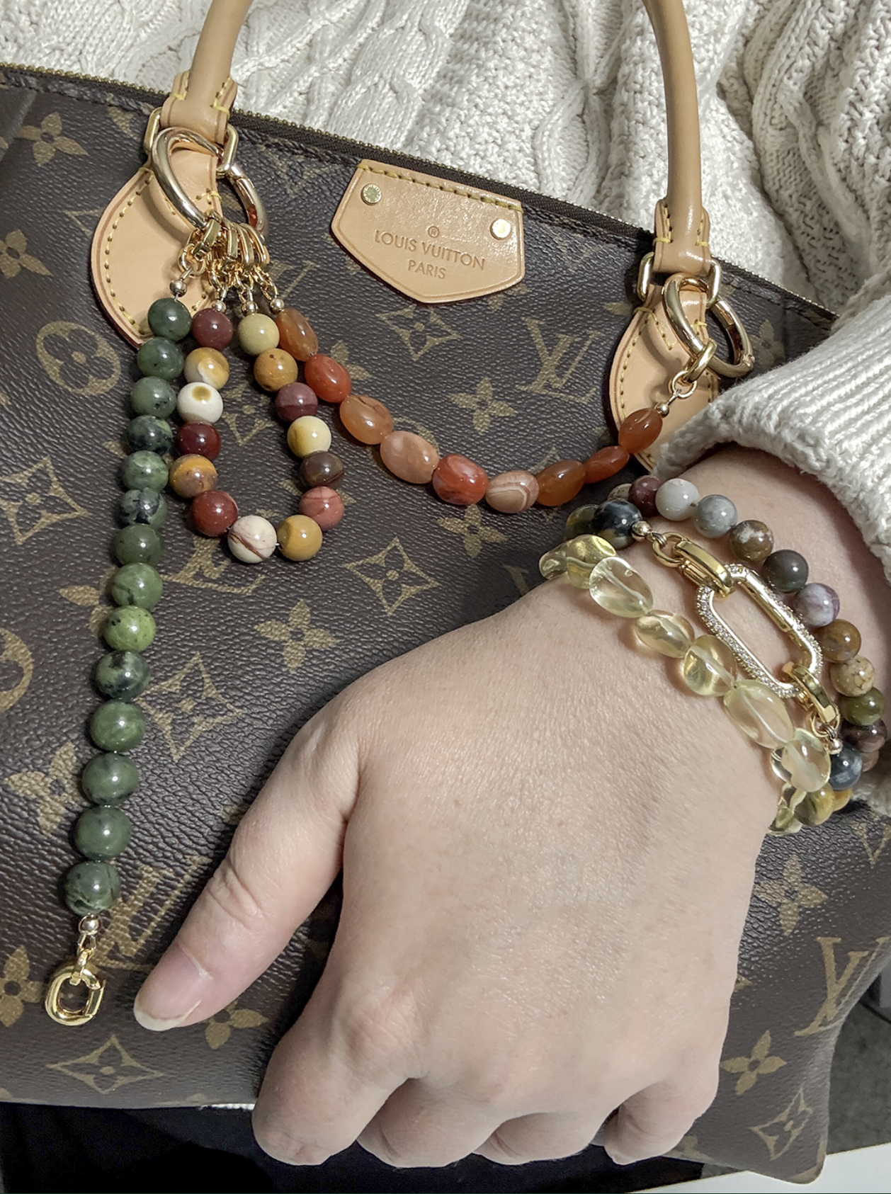 In 2025 I launched Hand/bag Bling, a collection of jewelry made from natural gemstones and real gold or silver that can be worn as bracelets and as bag charms (3 different ways to wear). I design and create each piece myself.